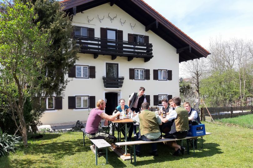 Nach altem Brauch besuchen junge Trachtenburschen am Ostermontag die ebenfalls jungen Trachtendirndl zum sogenannten “Oster-Schnapseln” – wie zum Beispiel auf diesem Bild, das Burschen vom Atzinger Trachtenverein “Daxenwinkler” bei ihrem Besuch von Manuela in Bachham zeigt.