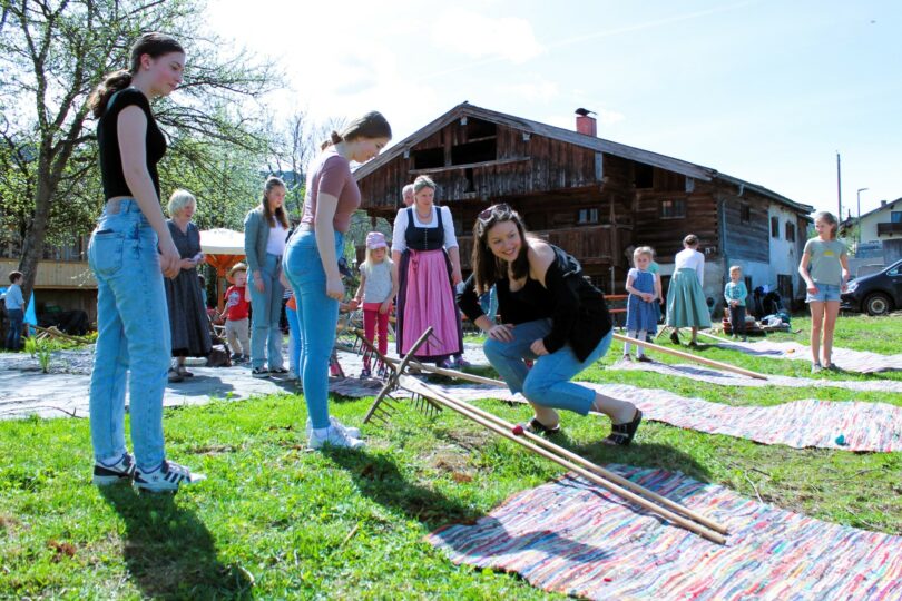 Das Programm lautete „Oarscheibm & Singa mit da Oma“ und wurde, begünstigt durch frühlingshafte Bedingungen, ein voller Erfolg. Reichlich Spaß und Freude hatten weit über 50 junge Besucher von der Kindergartenliga bis zur beginnenden Teenie Phase, etwa beim legendären Brauch gekochte und gefärbte Ostereier über Stiele gekreuzter Holzrechen oder eigens konstruierten Startrampen rollen zu lassen. Wertvolle Tipps vermittelten unter anderem junge Helferinnen und Helfer vorwiegend aus bäuerlichen Familien stammend, in denen derartiges Osterbrauchtum zur Förderung der Gemeinschaft auch im Zeitalter von Smartphone und KI (Künstliche Intelligenz) noch gepflegt wird. Ein Freilandhühner-Landwirt aus dem Ortsteil Thalham hatte sogar passende bunte Legeprodukte gesponsert.