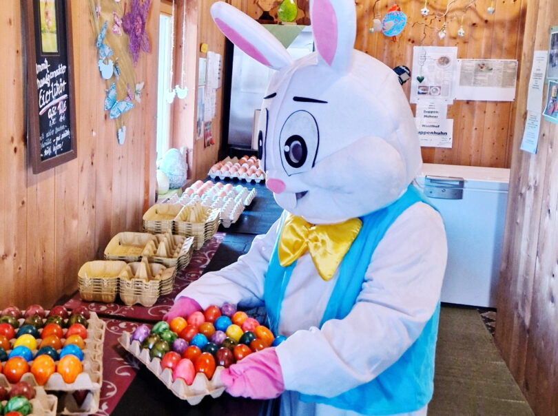 Der Osterhase wird dieser Tage immer mal wieder am Hofladen Wastlhof gesehen. Denn auch er will sich sicher sein, wo die Eier, die er dieser Tage so fleißig versteckt herkommen.