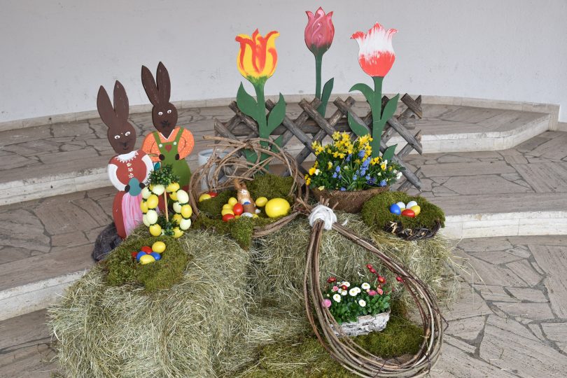 Die Osterhasenfamilie ist auch in diesem Jahr in Schleching eingetroffen. Die Mitglieder des Gartenbauvereins Schleching Olaf Kokoschka und Ingrid Lukas haben für sie ein gemütliches Heim aus Moos und Stroh bereitet. Dort stehen sie zwischen bunten Eiern, Osterkörbchen, frischen Blumen und eingerahmt von großen Tulpen aus Holz und einem Holzzaun.
