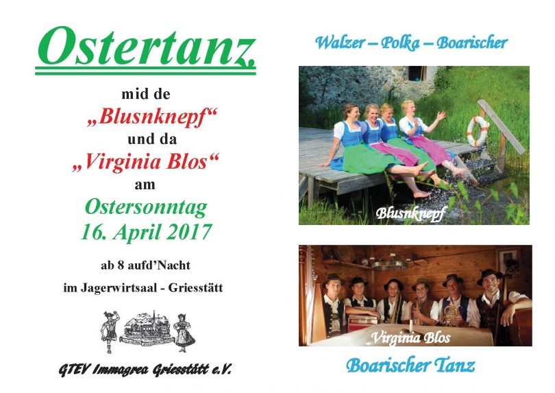 Am Ostersonntag ist in Griesstätt wieder der traditionelle Ostertanz im Jagerwirtsaal. Beginn ist um 20 Uhr mit den Musikgruppen „Blusnknepf“ und „Virgina Blos“.