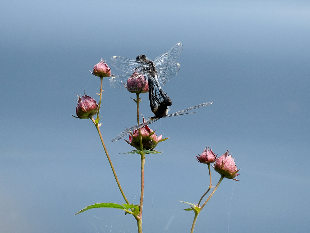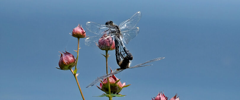 Zwei Fotos von paarende Zierliche Moosjungfern im Rimstinger Chiemseeuferbereich.