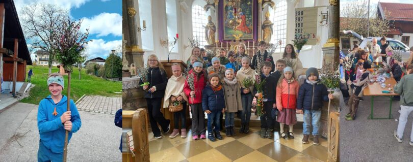 Alljährlich treffen sich die Trachtenkinder des Trachtenvereins “Almarausch” Hittenkirchen, um gemeinsam mit den Jugendleitern und den Eltern Palmbuschen zu binden. Diese gute Tradition konnte auch heuer wieder vorm Hittenkirchener Trachtenheim durchgeführt werden. Am vergangenen Palmsonntag trugen die Kinder und Jugendlichen dann stolz die mit Palmzweigen, Buchs und buntem Papier geschmückten Palmbuschen zur Weihe.