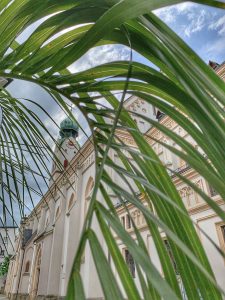 Sommerliche Temperaturen laden auch bei einem Stadtbummel zum Verschnaufen und zum Verweilen ein. Da könnte es nicht besser passen, dass die aufgestellten Palmen dazu ein perfektes Bild abgeben. Umgarnt vom tropischen Gewäsch gibt die Stadtpfarrkirche St. Nikolaus gleich einen etwas anderen Anblick ab. Es lohnt sich einfach immer, mit offenen Augen durch die Stadt zu marschieren.