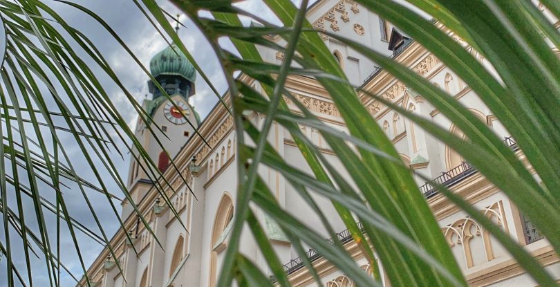 Sommerliche Temperaturen laden auch bei einem Stadtbummel zum Verschnaufen und zum Verweilen ein. Da könnte es nicht besser passen, dass die aufgestellten Palmen dazu ein perfektes Bild abgeben. Umgarnt vom tropischen Gewäsch gibt die Stadtpfarrkirche St. Nikolaus gleich einen etwas anderen Anblick ab. Es lohnt sich einfach immer, mit offenen Augen durch die Stadt zu marschieren.