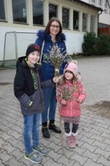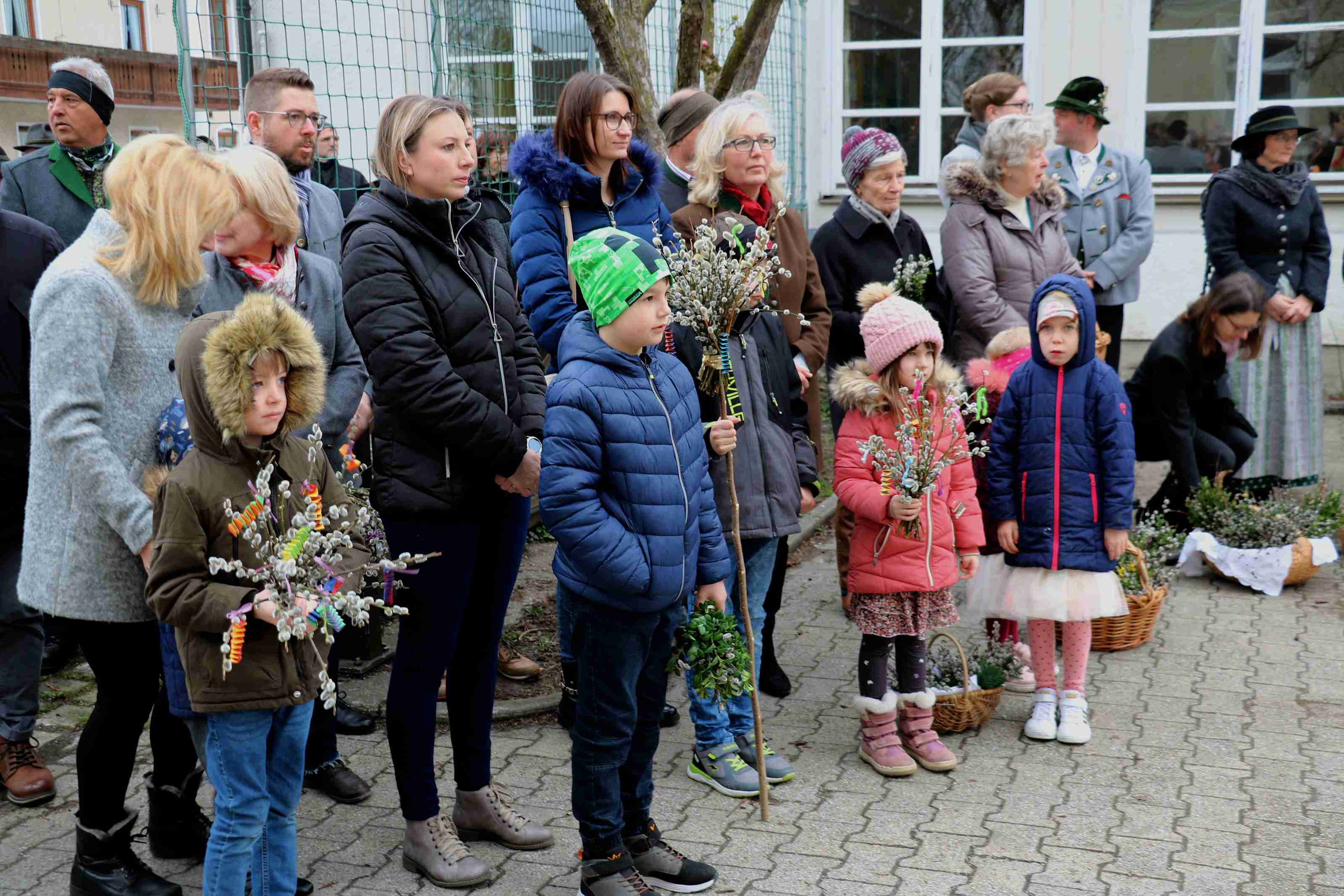 Am ersten Feriensonntag, dem Palmsonntag, trafen sich die Frasdorfer Buben und Mädchen mit den Palmbuschen im Schulhof zur Palmweihe. Sie brachten Palmzweige und kunstvoll mit Bändern gezierte Palmbuschen zum Segnen.