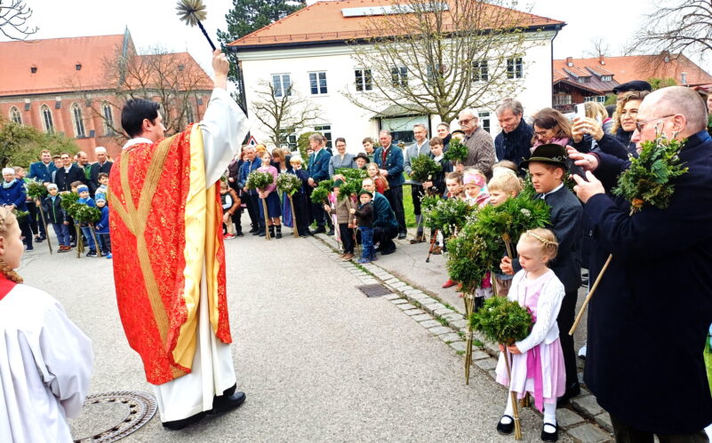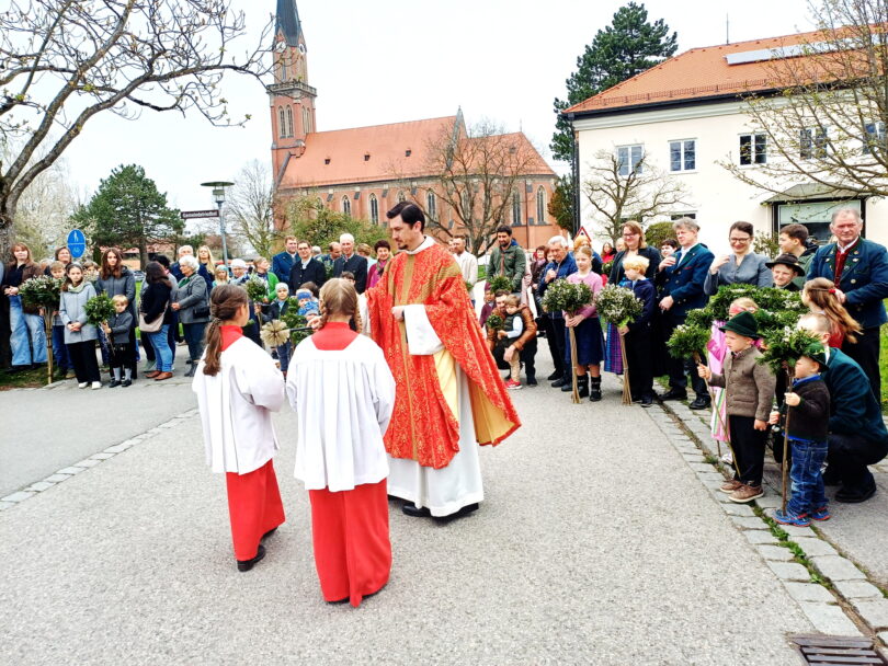 Zur Palmweihe vor dem katholischen Pfarrheim in Übersee schien die ganze Pfarrgemeinde auf den Beinen zu sein: feierlich eingeleitet von den Klängen der Blaskapelle sprach Pfarrvikar Pater Andrei einführende Worte und Gebete, bevor er rund um den Platz ging und die hunderten von großen und kleinen Palmbuschen weihte, die die festlich gekleideten Gläubigen und sehr viele Kinder in Händen hielten.