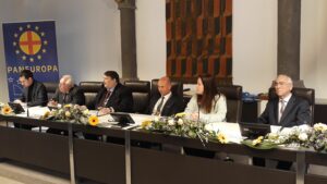 V.r.n.l. Bundesminister a.D. Dr. Theo Waigel, Generalkonsulin Corinne Pereira da Silva, Oberbürgermeister Thomas Kiechle, die Paneuropa-Präsidenten Bernd Posselt und Alain Terrenoire sowie der Bundesvorsitzende der Paneuropa-Jugend, Christian Hoferer.