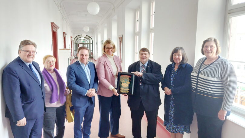 Bericht und Foto: Paneuropa-Union – Im Augsburger Rathaus v.l.n.r.: Johannes Kijas, Juliane Glöckler, Volker Ullrich, Oberbürgermeisterin Eva Weber und Bernd Posselt mit der Gedenkplakette an die Daytoner Friedensverhandlungen, Stephanie Waldburg und Katharina Grimm.