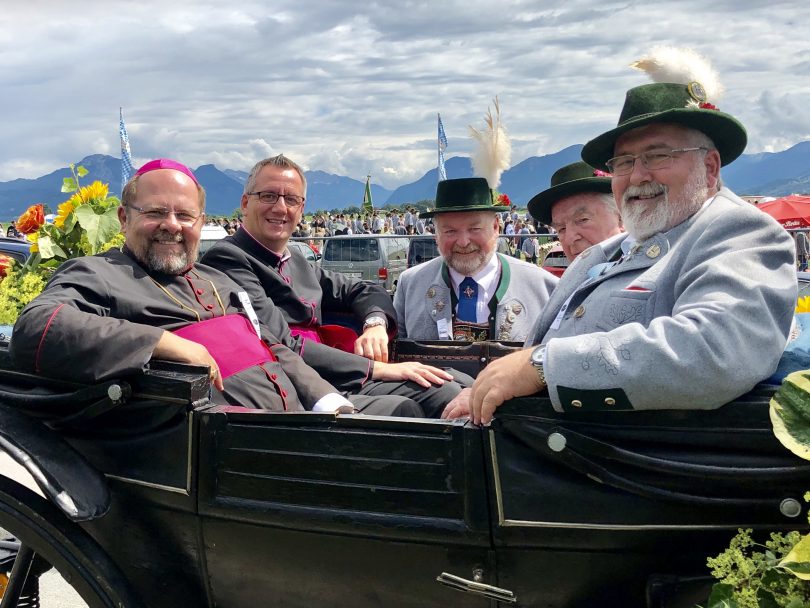 Höhepunkt beim heurigen Gaufest des Bayerischen Inngau-Trachtenverbandes in Rosenheim-Pang waren ein Festgottesdienst bei Regen im Festzelt und ein Festumzug bei Sonnenschein. Verständlich, dass am nachmittag die Ehrengäste in der Festkutsche gut zu lachen hatten. Unsere Aufnahme zeigt von links Weihbischof Wolfgang Bischof, Domkapitular und Dekan Daniel Reichel, Gauvorstand Schorsch Schinnagl sowie vom Bayernbund den Ehrenvorsitzenden Adolf Dinglreiter und Landesvorsitzenden Sebastian Friesinger.