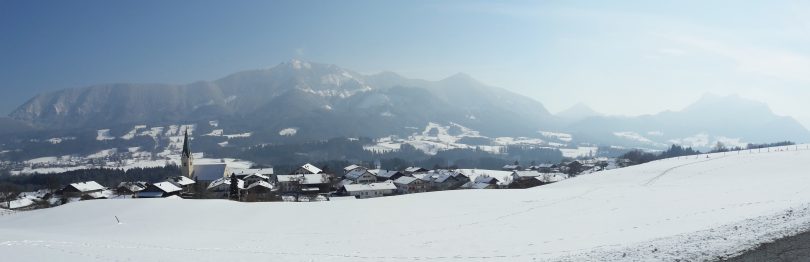 Aus vier Einzelaufnahmen ist dieses Panoramabild mit Blick auf Törwang am Samerberg entstanden. Tiefster Winter und eisige Kälte bei spürbarem Wind – da heißt es, sich warm anzuziehen, um die Schönheit der Samerberger Natur zu genießen.