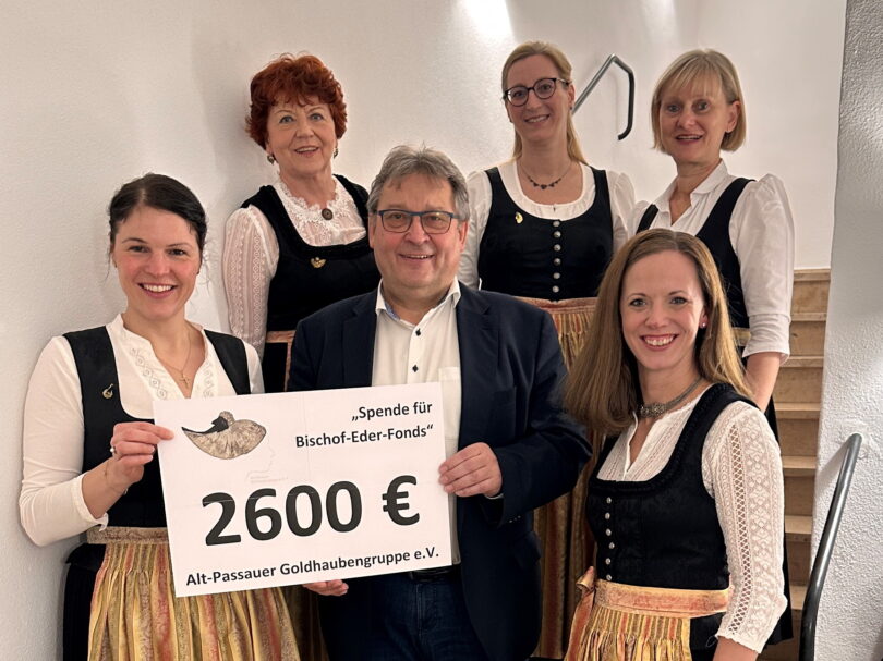 Bericht und Foto: Katrin Vogl / Goldhaubengruppe – Bildunterschrift: Spendenübergabe der Passauer Goldhaubengruppe an den Bischof-Eder-Fond