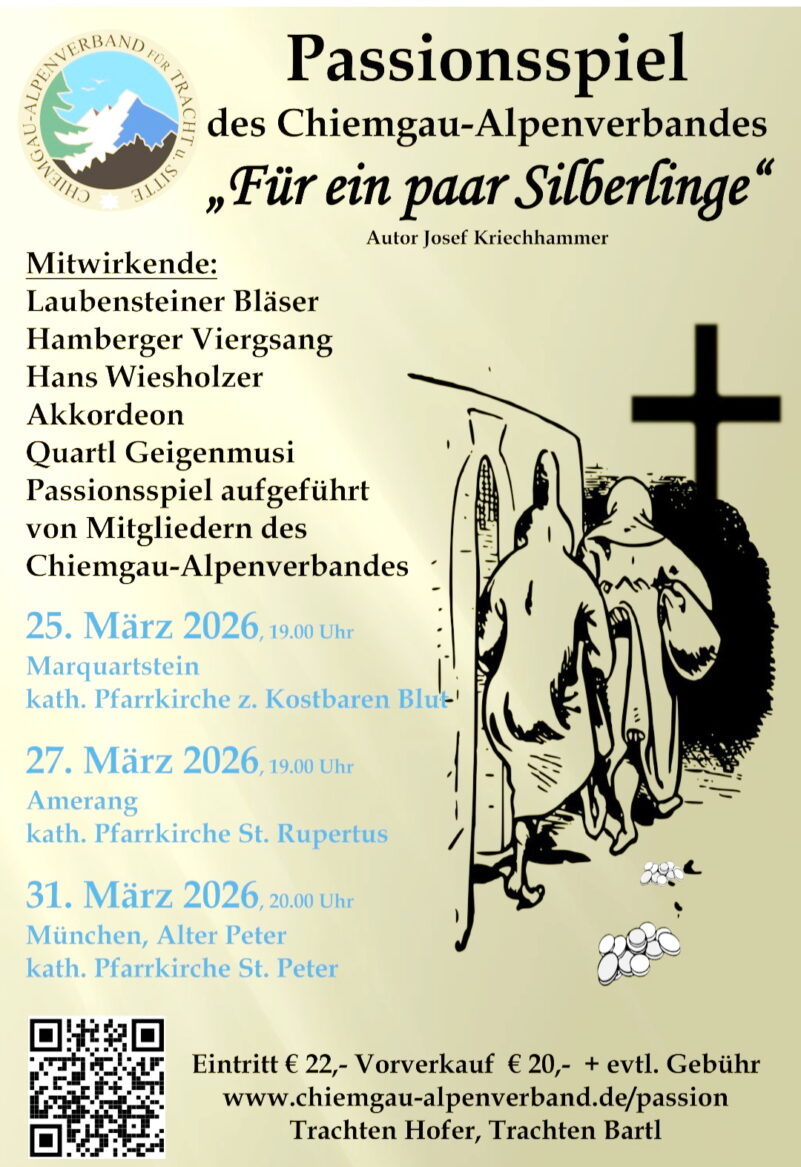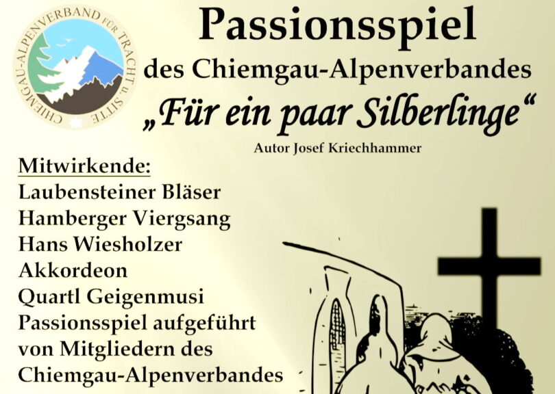 Zum Auftakt des Jubiläums “100 Jahre Chiemgau-Alpenverband für Tracht und Sitte” bieten die Chiemgauer Trachtler an drei Orten und Terminen das Passionsspiel “Für ein paar Silberlinge” von Josef Kriechhammer an. Die Premiere am Mittwoch, 25. März in der Katholischen Pfarrkirche “Zum Kostbaren Blut” in Marquartstein ist bereits ausverkauft. Für die zweite Aufführung am Freitag, 27. März ab 19 Uhr in der Katholischen Pfarrkirche “St. Rupertus” in Amerang sind noch Karten im Vorverkauf bei Trachten Hofer in Grassau und bei Trachten Bartl in Prien erhältlich. Für die dritte Aufführung am Dienstag, 31. März in München in der Katholischen Pfarrkirche “St. Peter” gibt es noch Karten bei den genannten Trachtengeschäften sowie online auf www.chiemgau-alpenverband.de/passion.