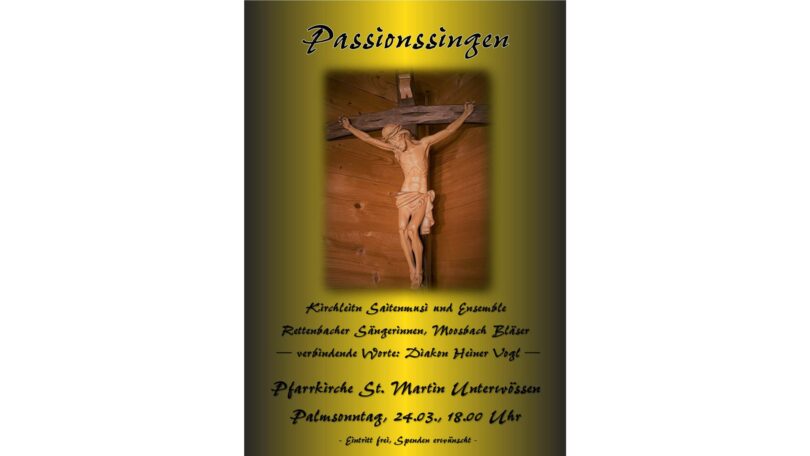 Zu einem Passionssingen im Pfarrverband Oberes Achental wird am Palmsonntag, den 24. März 2024, um 18.00 Uhr herzlich eingeladen. In der Pfarrkirche St. Martin in Unterwössen werden das Kirchleitn Ensemble, die Rettenbacher Sängerinnen und die Moosbach Bläser mit geistlichen Liedern und Weisen die Karwoche einläuten. Die verbindenden Worte spricht Diakon Heiner Vogl. Der Eintritt ist frei, jedoch werden Spenden erbeten.