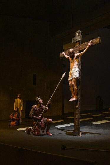 Fotoprobe zu den Passionsspielen Erl 2019. Im kleinen Ort Erl, im Herzen des österreichischen Tirols, werden seit seit mehr als 400 Jahren alle sechs Jahre Passionsspiele aufgeführt. Vom 26. Mai bis 5. Oktober 2019 beteiligen sich rund 500 Laiendarsteller der 1450 Einwohner der Gemeinde Erl aktiv und unentgeltlich am Passionsspiel. Dieses Bild zeigt die Kreuzigungsszene mit Florian AHrlander als gekreuzigter Christus