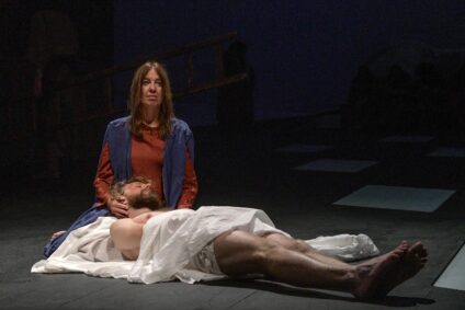 Fotoprobe zu den Passionsspielen Erl 2019. Im kleinen Ort Erl, im Herzen des österreichischen Tirols, werden seit seit mehr als 400 Jahren alle sechs Jahre Passionsspiele aufgeführt. Vom 26. Mai bis 5. Oktober 2019 beteiligen sich rund 500 Laiendarsteller der 1450 Einwohner der Gemeinde Erl aktiv und unentgeltlich am Passionsspiel. Dieses Bild zeigt den Leichnamdes Jesus, im Schoß seiner Mutter, die von Renate Maier dargestellt wird.