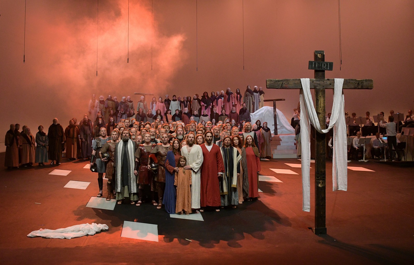 Fotoprobe zu den Passionsspielen Erl 2019. Im kleinen Ort Erl, im Herzen des österreichischen Tirols, werden seit seit mehr als 400 Jahren alle sechs Jahre Passionsspiele aufgeführt. Vom 26. Mai bis 5. Oktober 2019 beteiligen sich rund 500 Laiendarsteller der 1450 Einwohner der Gemeinde Erl aktiv und unentgeltlich am Passionsspiel. Dieses Bild zeigt die Schlußszene, in der alle Schauspieler gemeinsam, vor dem leeren Kruzifix, das Lied “großer Gott wir loben Dich” singen.