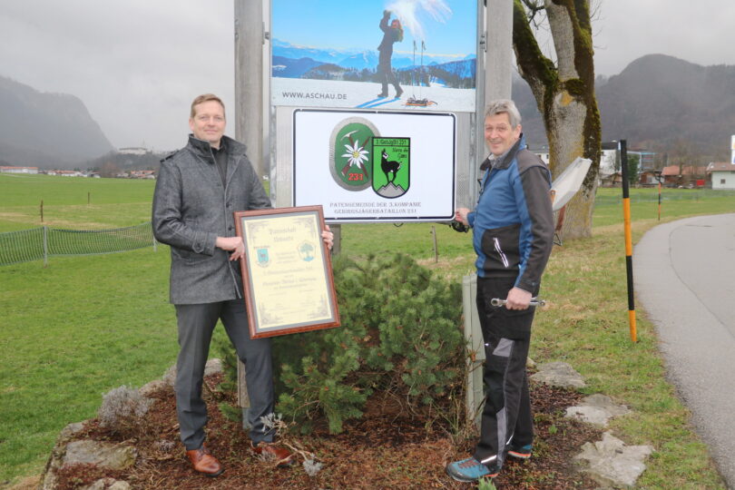 Der Kompaniechef der dritten Kompanie des Gebirgsjägerbataillons 231 Major Marcel Zens und der Kompaniefeldwebel Oberstabsfeldwebel Klaus Fischer überreichten Bürgermeister Simon Frank die neuen Schilder für die Aschauer Ortseingänge. „Wir Gebirgsjäger des Bataillons 231 zeigen mit diesen Patenschaftsschildern greifbar und anschaulich unsere langjährige Verbundenheit mit den Gemeinden in der Region Südostbayern“. Bereits zur Jahrtausendwende schlossen die dritte Kompanie und die Gemeinde Aschau formell und feierlich ihre Patenschaft. Der Kompaniechef der dritten Kompanie Hauptmann Hofbauer und Bürgermeister Kaspar Öttl unterschrieben damals die beiden Urkunden. Die Ausfertigung der Gemeinde hängt seither im Dienstzimmer des Bürgermeisters. Die Gemeinde Aschau hält seit Jahrzehnten engen Kontakt mit der jeweiligen Kompanieführung, sei es durch die Teilnahme von Veranstaltungen am Standort Bad Reichenhall, durch die alljährliche Einbindung ins Ferienprogramm der Gemeinde oder durch die Durchführung des Feierlichen Gelöbnisses.