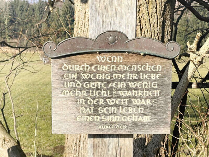 Auch außerhalb der Kirche „Maria Stern“ finden sich immer wieder Zeugnisse und Spuren von Alfred Delp. So unter anderem an einem Wegweise „Alfred-Delp-Straße“ in Neukirchen oder bei einem Wegkreuz mit einem prägenden Spruch des Jesuiten: „Wenn durch einen Menschen ein wenig mehr Liebe und Güte / ein wenig mehr Licht und Wahrheit in der Welt war – hat sein Leben einen Sinn gehabt“.