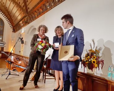 Hiltrud Schönheit, Vorsitzende des Katholikenrats der Region München, Preisträgerin Monika Götz sowie Benedikt Breil, Vorstandsmitglied des Bundes der Deutschen Katholischen Jugend (BDKJ) in der Region München und Moderator der Abends, bei der Überreichung von Medaille und Urkunde.