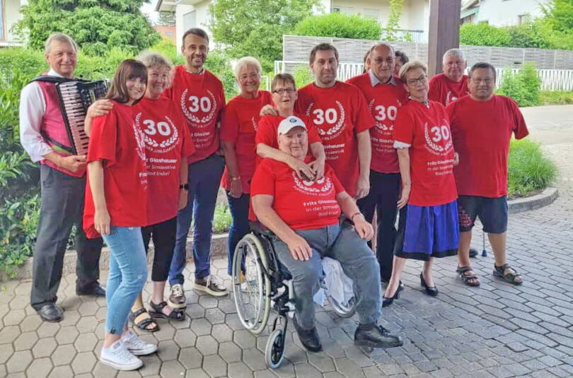 Das gesamte Team der Simssee Klinik Bad Endorf begleitet ihn während seiner stationären Rehabilitation in über 30 Jahren zuverlässig, kompetent und menschlich in der Betreuung. Angesprochen darauf, was ihn in der Klinik am meisten beeindruckte, am meisten in Erinnerung über all die Jahre sei, kommt ohne nachzudenken: „Die tollen Menschen hier bei euch! Ich bin nicht nur eine Nummer, ihr kennt mich alle extrem gut und das bedeutet mir und meiner Frau sehr viel. Das hilft dann auch wieder im Alltag, das anzuwenden, was ihr mir in der Reha beibringt.“ Friedrich Glashauser hat über die Jahre hinweg eine nie nachlassende Betreuung gespürt. Die Professionalität war immer die gleiche, auch wenn er wieder einmal zur nächsten Reha eintraf, mit sich kämpfte, ob es denn Sinn machte – weil der Weg doch so holprig, anstrengend und oftmals endlich wirkte. „Was ich hier schätze, ist die familiäre Atmosphäre, die traumhafte Lage und die Ruhe, die ich zur Genesung hier finde. Und natürlich die Ärztinnen und Ärzte, die Schwestern und die Therapeuten, einfach spitze und ich finde einen Sinn zum Leben für mich.“ Glashauer schätzt daneben die gute Küche, die ihn an zuhause erinnert. Für ihn sind die Menschen der Simssee Klinik enger Teil seines Lebens. Um sich bei diesen Menschen zu bedanken, organisierten er und seine Frau, die ihn in all der Zeit den Rücken freihielt, eine Dankes-Feier in der Antonius-Stube. Völlig überraschte er damit das Team, denen er aus eigener Tasche finanziert, jedem ein eigenes T-Shirt finanziert. Dazu spielte ein Bad Endorfer Musiker auf, es gab eine leckere Brotzeit und Friedrich Glashauser ist glücklich, so Danke sagen zu können.