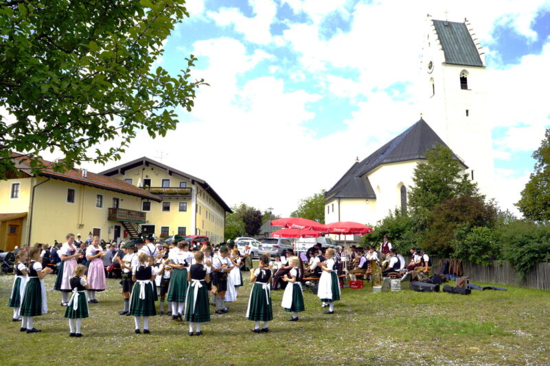 – Das Patroziniumsfest auf dem Dorfplatz mit der Kirche St. Bartholomäus im Hintergrund. Die Kinderplattlergruppe des GTEV Almenrausch Rossholzen zeigt den “Auftanz”.