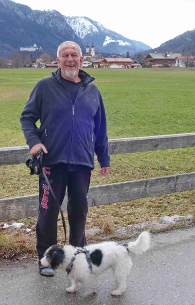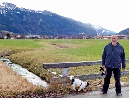Fotos: Hötzelsperger – Prof. Peter Michael Hamel in seinem Komponisten-Büro und am Schafelbach mit seiner Hundedame Dona und mit Blick nach Aschau mit Burg Hohenaschau und Pfarrkirche „Zur Darstellung des Herrn“.