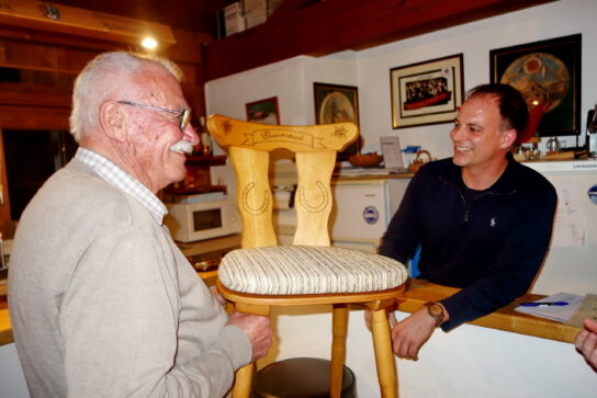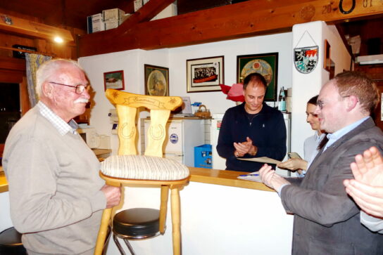 - Ehrenvorstand Peter Freund bekommt für seinen Platz in der Vereinshütte einen Ehren-Stuhl von seinem Sohn und nunmehrigen Vorstand Josef Freund