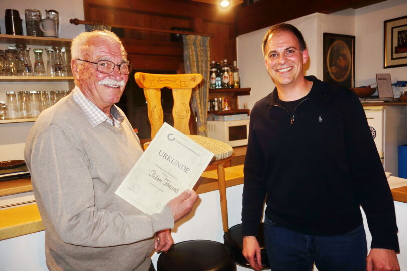 Peter Freund aus Prien-Siggenham ist neuer Ehrenvorsitzender vom Hufeisenverein Kaltenbach. Die Verleihung dieser besonderen Würde erfolgte durch seinen Nachfolger und Sohn Josef Freund bei der Jahres-Mitgliederversammlung in der Vereinshütte in Kaltenbach. Dabei erinnerte der aktuelle Vorstand an die jahrzehntelangen Verdienste von Peter Freund.