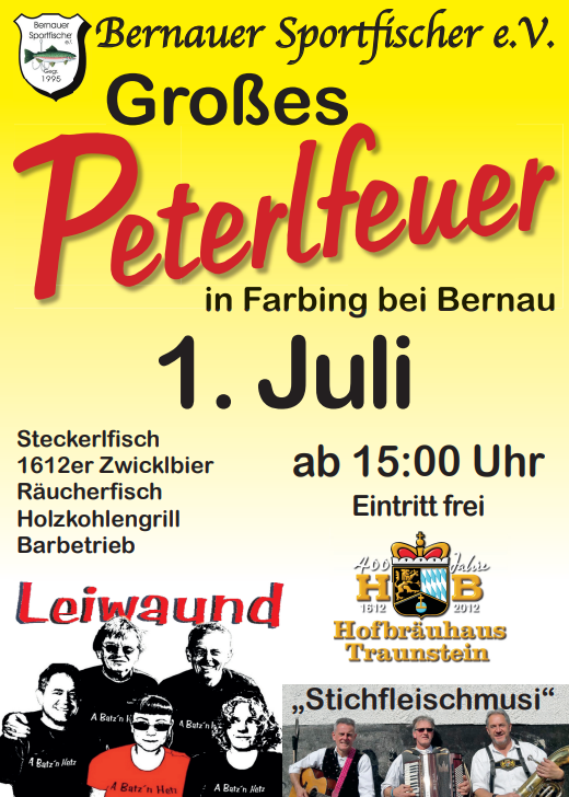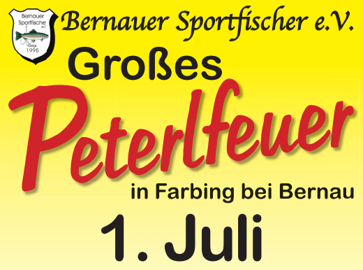Die Bernauer Sportfischer e. V. veranstalten am Samstag, 01.07.2023 ab 15 Uhr ihr großes Peterlfeuer in Farbing.