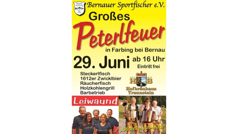 Die Bernauer Sportfischer laden auch in diesem Jahr am Samstag, den 29. Juni wieder ein zu ihrem allseits beliebtem Peterlfeuer an den Farbinger Weihern.