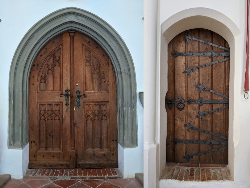- Die spätgotische Sakristeitüre im Altarraum von St. Florian, mit den handgeschmiedeten Türbeschlägen, die in Form von Lilienenden auslaufen.
