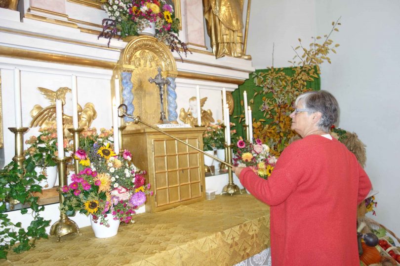 Was hat ein Mesner oder eine Mesnerin für Aufgaben? Zu dieser Frage antwortet Rita Stoib rasch und einfach: „Das ist wie in einem Haushalt, Du musst schauen, dass alles sauber und in Ordnung ist, aber Du bist nicht alleine für alles zuständig“. Als Aufgaben zählt sie dann unter anderem auf: bei Gottesdiensten Kirche und Tabernackel aufsperren, Kerzen anzünden, Hostien, Wasser, Wein, Lichter, Meßgewänder und Unterlagen für die Lektoren herrichten, sowie Glockenläuten vor und zum Gottesdienst. Natürlich gibt es im Jahreslauf verschiedene Anlässe, zum Beispiel Hochfeste wie Ostern, Weihnachten, Erntedank oder das Patrozinium. Da gilt es auch auf die richtige Auswahl der Messgewänder zu beachten. „Hilfreich ist dabei das vom Erzbischöflichen Ordinariat herausgegebene Direktorium, in diesem ist für jeden Tag bis ins Detail alles genau festgehalten, was zu beachten ist, das ist eine große Hilfe“ – so Rita Stoib, deren Tätigkeit im Rahmen einer geringfügig Beschäftigten entlohnt wird. Im Direktorium ist im übrigen auch festgehalten, an welchem Ort beziehungsweise in welcher Kirche „Ewige Anbetung“ ist. Diese ist täglich und immer am gleichen Tag für einen Ort, in Wildenwart ist das am 29. März. Nachdem in der Pfarrei Wildenwart kein festangestellter Pfarrer wohnt, wird Wildenwart von unterschiedlichen Seelsorgern aus dem Pfarrverband Westliches Chiemseeufer versorgt und betreut. „Da gilt es, sich auf die jeweiligen persönlichen Wünsche der Geistlichen einzustellen, aber letztlich macht diese Situation das Arbeiten auch abwechslungsreicher“. Weitere Aufgaben der zukünftigen Mesnerperson sind nach einem Fest- oder Wortgottesdienst sowie nach einer Taufe, Hochzeit oder Beerdigung das Abräumen und wieder Zusperren. Um die Ministranten sorgt sich der Mesner oder die Mesnerin „nur“ was das richtige und saubere Gewand anbelangt, deren Dienste und Vorbereitungen liegen in der Hand der Seelsorger oder Oberministranten. „In Wildenwart haben wir das große Glück, dass wir mit Pfarrgemeinderat Georg Kronast einen enorm engagierten Mithelfer haben, wenn es um den Kirchen- und Blumenschmuck geht“ – mit diesem Hinweis und mit der Information, dass die Wildenwarter ehrenamtlich fleißig zur Stelle sind, wenn es zum Beispiel um den im Jahr zweimal stattfindenden Kirchen-Putz, um die Vorbereitungen für den Erntedank oder um das Aufstellen der Christbäume geht, weist sie darauf hin, dass das Zusammenwirken auch mit der Geistlichkeit, mit der Kirchenverwaltung und mit dem Pfarrgemeinderat angenehm und unkompliziert ist. „Natürlich gibt es manchmal Tage, an denen hintereinander mehr los ist, gerade wenn Taufen und Hochzeiten sind, aber dafür ist es gerade im Sommer wieder ruhiger“. Rita Stoib hat ihren Dienst in der Wildenwarter Kirche und mit der Pflege des Priestergrabes im Friedhof immer gerne gemacht, weil sie persönlich Glauben pflegt und Kirche schätzt. „Aber jetzt darf ich an meinen Mesner-Ruhestand denken und so wünsche ich mir, dass sich bald eine Nachfolgerin oder Nachfolger findet, bei der Einarbeitung helfe ich natürlich gerne mit“.