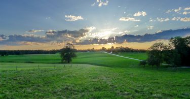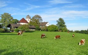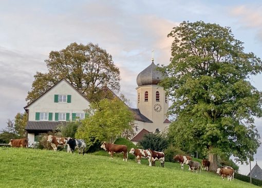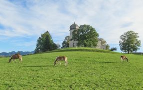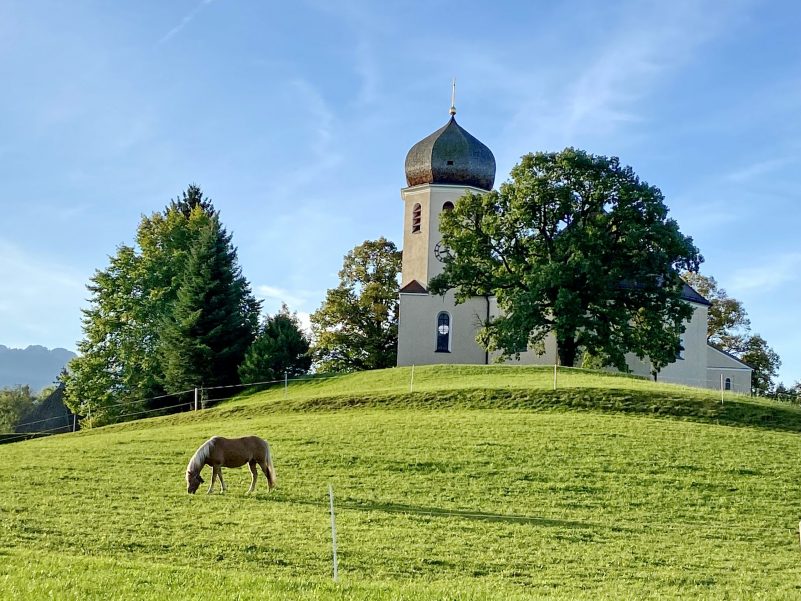 Einen schönen Beitrag zum Tierwohl leisten die Wiesen rund um die auf einem sanften Hügel erbauter Pfarrkirche “Christkönig” von Wildenwart. Wie diese Aufnahmen zeigen, fühlen sich auf der Nordseite die jungen Pferde geradeso wohl wie auf der Südseite die Kühe.