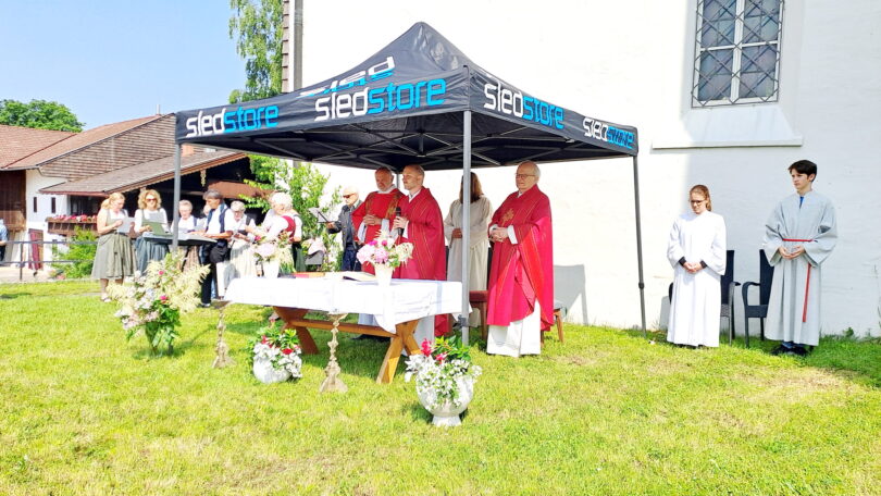 Bei schönsten Frühsommerwetter fand vor der Kirche St. Ägidius die Feldmesse statt. Pfarrer David Mehlich, Pfarrer i.R. Christoph Kronast und Diakon Georg Oberloher zelebrierten einen Gottesdienest, bei dem, wie Pfarrer David Mehlich eingangs verkündete, die spirituelle Botschaft des Heiligen Geistes über allem schwebe und in Form des leichten Windes auch in den Liedblättern des Chores spürbar sei. Den festlichen Gottesdienst haben auch die beiden Gemeindereferentinnen Conny Doppelberger und Jacqueline Egold mitgefeiert. Musikalisch haben Sepp Beck am Keyboard und die Sängerinnen und Sänger des Albertaicher Kirchenchores den Gottesdienst untermalt.