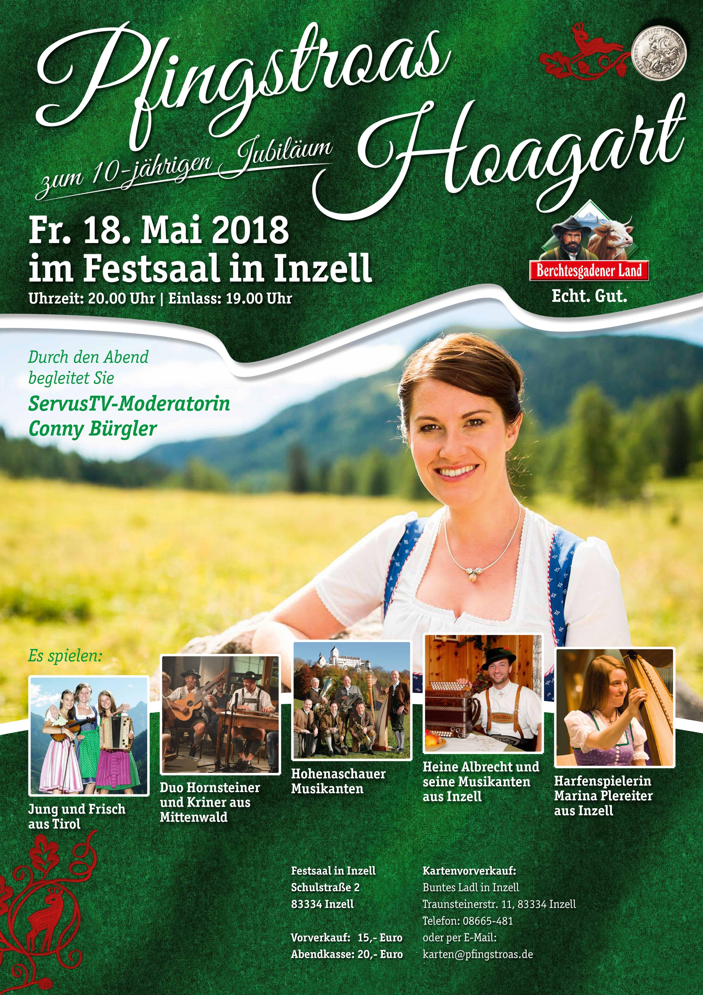 Am Freitag, 18. Mai findet um 20 Uhr der heurige Pfingstroas-Hoagart im Festsaal in Inzell statt. Folgende Mitwirkende haben ihr Kommen zugesagt: