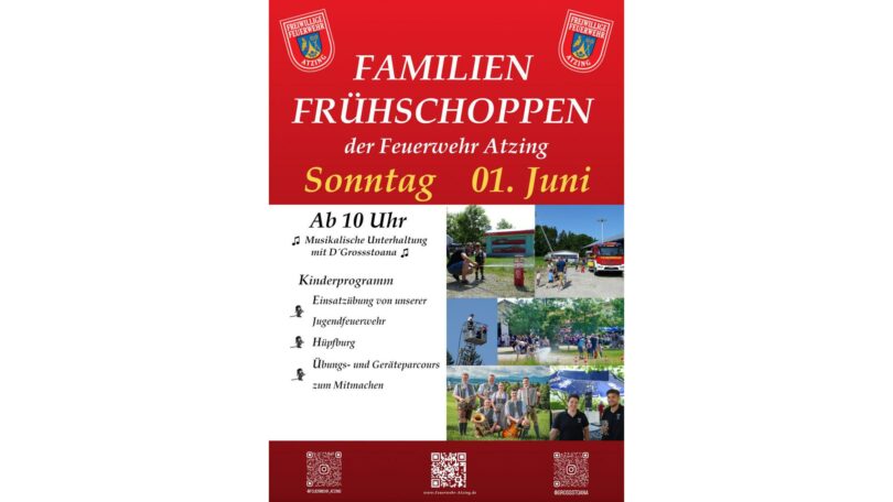 Die Freiwillige Feuerwehr Atzing lädt am Sonntag, 1. Juni, zum traditionellen Familienfrühschoppen ein. Beginn ist um 10 Uhr. Für musikalische Unterhaltung sorgt die Gruppe “D’Grossstoana”.