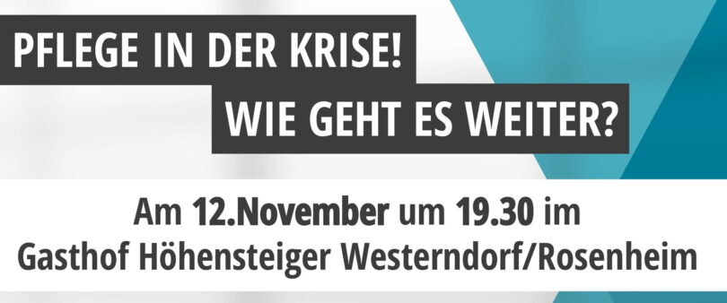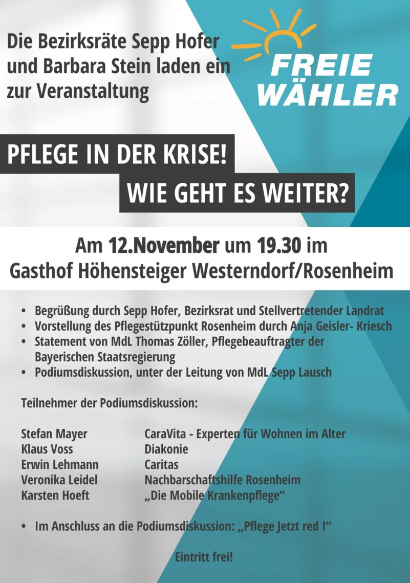 Pflege in der Krise-wie geht es weiter? So lautet das Motto eines hochkarätig besetzten Infoabends, der am Dienstag, 12.November um 19.30 Uhr im Gasthof Höhensteiger in Westerndorf/Rosenheim stattfindet. Ehrengast wird der Pflegebeauftragte der Staatsregierung, MdL Thomas Zöller (FW) sein, weitere Teilnehmer der Podiumsdiskussion werden sein: