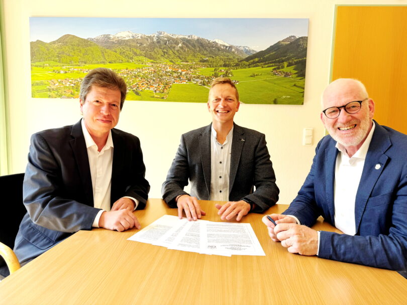Foto:  Elmar Stegmeier (links) erläutert dem 1. Bürgermeister Simon Frank (Mitte) und dem 2. Bürgermeister Michael Andrelang (rechts) im Rathaus Aschau im Chiemgau das CSU-Papier der Landtagsfraktion