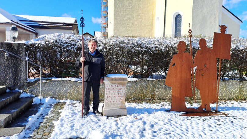 Bürgermeister Sepp Reithmeier mit der Nachbildung der Signumlanze des Beneficiariers, Tullius Iuvensis