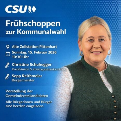 Pittenhart: Der CSU-Ortsverband lädt am Sonntag, 15. Februar um 10.30 Uhr zum Kommunalwahl-Frühschoppen in die „Alte Zollstation“ ein.