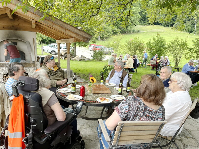 Foto: Sybilla Wunderlich – Die gemütliche Runde der Senioren im Garten, hinten links der Steinbackofen