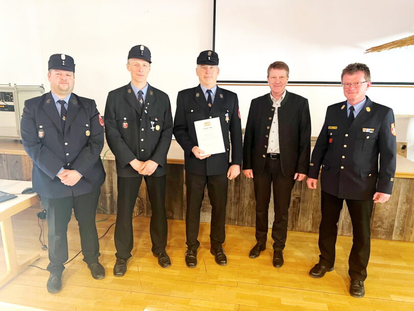 Foto: Christine Perl – Das Bild zeigt den geehrten Robert Perl mit zweiten Kommandant Stefan Tauber, ersten Kommandanten Andreas Böck, Bürgermeister Andreas Fenzl und Kreisbrandmeister Stefan Pfliegl (vlnr.).