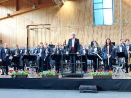 „American Beauties“ zusammengestellt von Naohiro Iwai (1923-2014) enthielt einige der schönsten amerikanischen Hits der vierziger und fünfziger Jahre voller jazziger Klänge, wie zum Beispiel „Oh!Carol!“, “Red Roses for a Blue Lady”, “Fly me to the Moon” oder “Bye, Bye, Birdie”. Spanische Lebensfreude vermittelte „Paconchita“, eine lateinamerikanische Ouvertüre von Oscar Navarro (*1981), deren Namen sich aus den Namen der Eltern des Komponisten zusammensetzt. Fünf Schlagwerker trieben mit viel Energie das Stück voran – mit Rhythmen auf den Pauken, Djemben und Kongas , Kuhglocken und Kastagnetten, sowie auf dem Schlagzeug. Bei dessen aussagekräftigem Solo ging der Dirigent zur Seite und ließ das Instrument und seinen Rhythmus mit Genuss voll zur Geltung kommen. Drei Zugaben von Johann Strauß, Robert Stolz und ein spanischer Tanz beschlossen ein ganz besonderes Konzerterlebnis, für das sich die Besucher mit großzügigen Spenden bedankten. Über 5.000 Euro kamen für das Herzenswunsch-Hospizmobil zusammen (eigener Bericht).