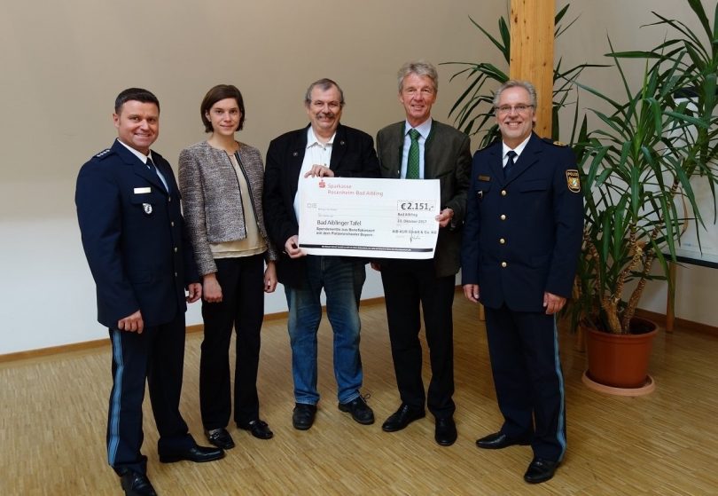 Unter dem Titel „Blue“ präsentierte das Polizeiorchester Bayern am 22.09.17 ein Benefizkonzert der Extraklasse im Kurhaus Bad Aibling. Unter der Leitung des renommierten Chefdirigenten Professor Johann Mösenbichler wartete das Orchester mit einem abwechslungsreichen Programm aus großartigen und anspruchsvollen Stücken auf. Unter anderem wurde der Konzertmarsch „Burst of Blue“ von Robert Thurston und der „Militärmarsch Nr. 1“ von Franz Schubert dargeboten. Ein besonderes symphonisches Highlight waren Ausschnitte aus der Filmmusik zu „Fluch der Karibik“ und „Of Sailors and Whales“ von W. Francis McBeth. Die rund 400 Konzertbesucher waren sichtlich begeistert und ließen die Spendenboxen klingeln, so dass sich die Bad Aiblinger Tafel über eine Finanzspritze von 2.151 Euro freuen darf. Feierlich wurde der Spendenscheck am 23.10. im Beisein von Polizeipräsident Robert Kopp aus Rosenheim, 1. Bürgermeister Felix Schwaller und Teresa Foff und Josef Gsödl vom Polizeiorchester Bayern an Ulrich Sibbers von der Bad Aiblinger Tafel überreicht.