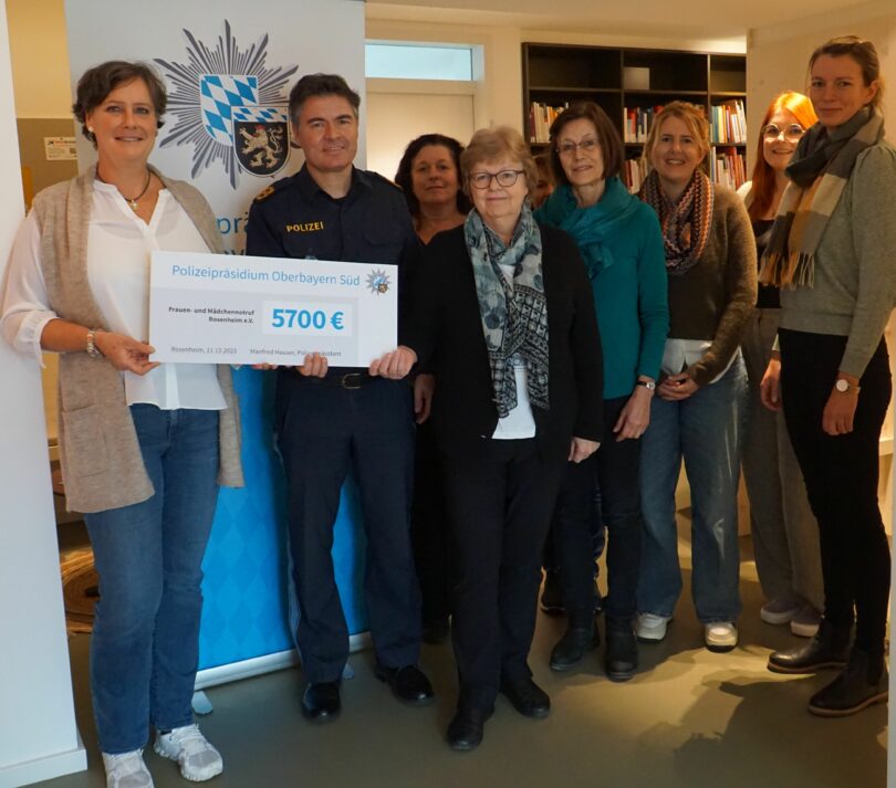 Die Mitarbeiterinnen und Mitarbeiter des Polizeipräsidiums Oberbayern Süd beteiligten sich wieder an der vorweihnachtlichen Spendenaktion. Der Polizeipräsident, Herr Manfred Hauser, überreichte an den Vorstand und an die Mitarbeiterinnen einen Scheck in Höhe von 5.700,00 Euro. Diese nahmen den Spendenbetrag mit großer Freude entgegen und bedankten sich im Namen des Rosenheimer Frauen- und Mädchennotrufs und der Klientinnen bei allen Spenderinnen und Spendern recht herzlich.