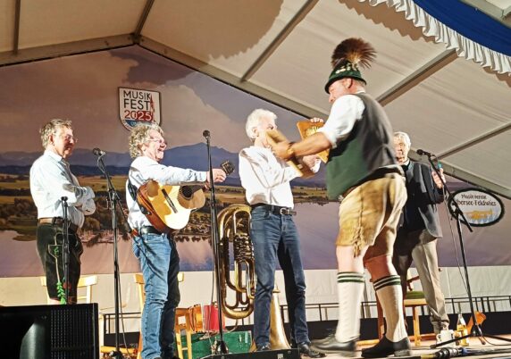 Bericht und Fotos: Christiane Giesen – Gerhard Polt (rechts) und die drei Well Brüder Michael, Christoph und Karli Well von links) faszinierten mit ihrem musikalischen Kabarett im Festzelt des Musikvereins Übersee vor 2.000 Besuchern.