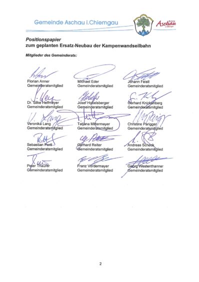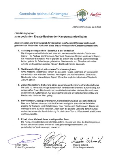 Bürgermeister und Gemeinderat der Gemeinde Aschau i. Chiemgau stellen sich geschlossen hinter das Vorhaben eines Ersatz-Neubaus der Kampenwandseilbahn.