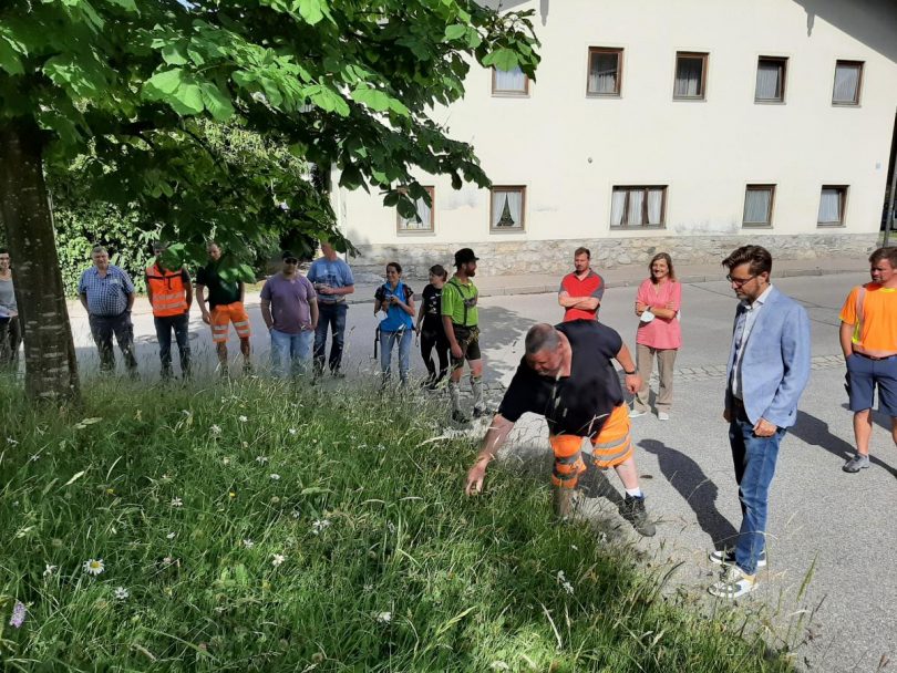 Fichter rät seinen Berufskollegen, dass sie sich die Flächen und deren Nutzung in ihrer Gemeinde genau anschauen. Bei der Fläche vor dem Stephanskirchner Vereinsheim reiche es beispielsweise, wenn sie nur zweimal im Jahr gemäht wird. Der ideale Mähzeitpunkt sei nach der Blüte, hier orientiert sich Fichter zum Beispiel an der Margerite. Idealerweise wird eine Mähtechnik gewählt, welche die ausgereiften Samen auf der Fläche verteilt. Wann immer es möglich ist, sollte Heu gemacht werden, denn das trage ebenfalls dazu bei, dass die Samen auf der Fläche verbleiben und gut verteilt werden. Schnittgut und Heu müssten von den Blühflächen unbedingt abtransportiert werden. Dies verhindere, dass die Flächen unnötig gedüngt werden und die Wildblumenarten durch andere, an nährstoffreichere und landwirtschaftlich genutzte Wiesen angepasste Arten verdrängt werden.