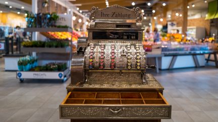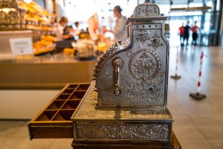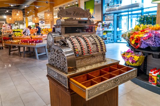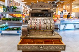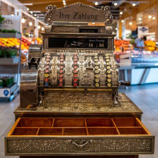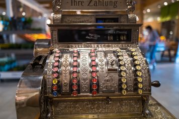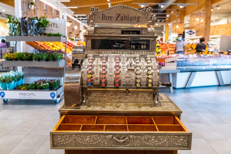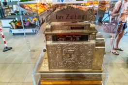 Fotos: Rainer Nitzsche – Die historische Registrierkasse, eine sehenswerte Schönheit beim Frischemarkt Prechtl in Raubling. Sie wird im Herbst auch in verschiedenen anderen Prechtl-Filialen ausgestellt. Die Kasse ist noch vollständig in Takt und betriebsbereit. Es lassen sich sogar noch Kassenbons ausdrucken!